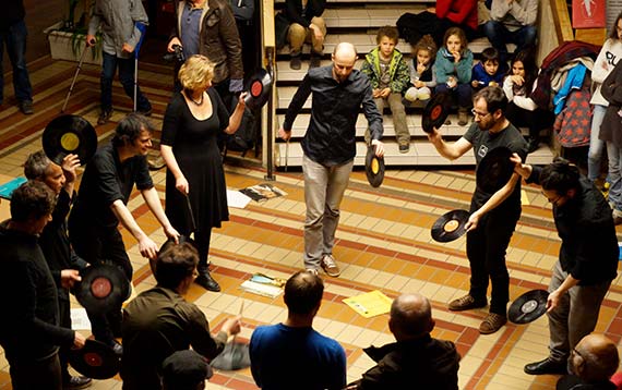 La suite du concert est assurée par l'OMEDOC, qui a accueilli les spectateurs avant l'entrée en salle par un jeu théâtral et rythmique avec des vinyles, frottés, rappés, vibrés, poncés, jetés, patinés...