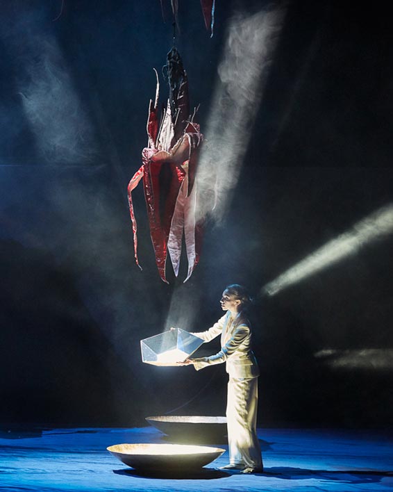 Si quelques moments arrivent à émerger avec une certaine poésie de ce prétentieux tissu de banalités, c'est grâce d'abord à la beauté vocale et à la présence scénique de Léa Desandre. La jeune mezzo déjà remarquée dans Alcyone se révèle une excellente comédienne et a bien du mérite à affronter, seule sur scène pendant près d'une heure quarante-cinq, la vacuité du propos et les outrances d'une mise en scène qui ne recule devant aucun gadget. Le pire étant sûrement cet énorme boudin gonflable noir — censé symboliser la mort et le néant — qui s'enfle pendant la chaconne finale au point de faire craindre une explosion inopportune, sans parler même de ces cactus de glace tombant des cintres qui s'égouttent lentement dans des bassines pendant la première partie du spectacle, les adieux à l'Enfance, d'une lenteur et d'une monotonie irrépressible où la protagoniste se mire longuement dans une sorte miroir convexe en se promenant à pas mesuré sur le plateau tandis qu'elle interpelle ses « jouets » dont le masque géant au centre de la scène est sans doute un des avatars.