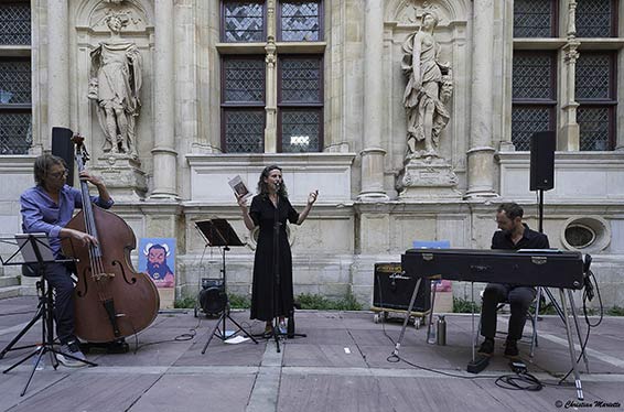 Dans la cour de l'hôtel d'Escoville, appelé aussi hôtel du Grand Cheval pendant la Renaissance, trois musiciens nous ont offert un répertoire poétique et jazz folk nourri de WH Auden, Emily Dickinson, Shakespeare, Tim Bukley, Joni Mitchell ou Thelonious Monk dont le Misterioso est parfaitement adapté au poème d'Auden choisi. Sans oublier Le luneux de Malicorne. La voix grave de Deborah Lennie, australienne installée à Caen, aussi capable de quelques égarements, le Fender Rhodes de François Chesnel, entre célesta et clavier plus âpre, la contrebasse sobre et souple de Patrice Grente, un bel univers en construction, entre compositions et reprises, depuis la fin du siècle dernier enfin révélé au public. Un cédé est en préparation.