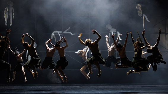 Le noir d’abord, et en ouverture un morceau trash métal de Système of a Down envahit la salle, de plus en plus fort comme un hurlement, avant de faire place au silence. Le rideau se lève sur trois groupes se tenant chacun sous un œuf grillagé d’où vont sortir trois corps, recueillis et portés par chaque cortège comme dans une naissance inversée, vers le bas et l’inanimé. Ensuite un thème électro floydien sans doute du collectif 79D (avec qui le chorégraphe travaille depuis 2008) installe l’ensemble des 19 danseuses et danseurs en quatre lignes qui vont suivre les rythmes pulsatifs soit ensemble, soit dans des figures alternées que sait si bien inventer Preljocaj, sur un principe quasi kaléidoscopique des corps et des membres. En arrière fond, une vidéo montre en déplacement lent un objet peut être minéral, ou encore l’arrière d’un crâne moussu sorti d’un ossuaire, qu’on retrouvera dans le tableau presque final, immobile et de face, ses cavités sombres et vides de tout.