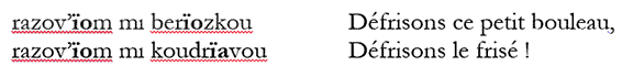 Il est aussi possible de traduire Eih, oukhnem ! par une onomatopée à tous usages, telle que « a-han ! » C’est la solution choisie par les traducteurs de l’Unesco2 dans la traduction du texte de la « Doubinouchka » à laquelle nous venons de faire référence et qui n’est qu’un trope de développement de Eih, oukhnem ! ayant inspiré Rimski-Korsakov dans son court poème symphonique op. 62 (voir infra). Ce terme de doubinouchka n’exige pas de traduction mais, comme pour Eih, oukhnem !, une brève explication est indispensable pour la bonne compréhension de ce qui suit. La racine du mot, doub, signifie « le chêne » ; son diminutif, doubina, « le gourdin, la matraque ou la trique » mais on appelle également ainsi le long rondin de bois dur qui sert d’instrument de levage. Doubinouchka peut donc être considéré comme un diminutif de diminutif, mais dépourvu de la nuance affective que la plupart des francophones croient faussement être toujours associée à ce procédé. Ces divers sens se retrouvent dans les centaines de versions et d’arrangements différents de cette chanson.