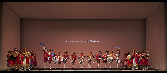 La scène fut entièrement dévoilée par une levée supplémentaire du rideau, les murs et le plafond passant de noir à gris et de gris à blanc et a bien des couleurs, les costumes de ville furent troqués contre d’autres, rutilants, inspirés du folklore des Balkans, de Grèce ...
