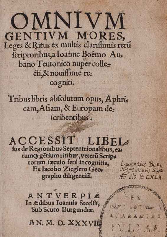 ![Omnium Gentium Mores, Leges & Ritus, ex multis clarissimis reru(m) scriptoribus [...] nuper collecti, & nouissime recogniti. Tribus libris absolutum opus, Aphricam, Asiam, & Europam describentibus. Accessit Libellus de Regionibus Septentrionalibus [...] Ex Iacobo Zieglero Geographo diligentiss.(imo). Antwerp, Joannes Grapheus for Joannes Steelsius 1537.](i/boemus_johann_01.jpg)