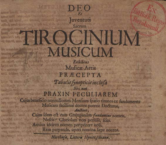 Deo et juventuti sacrum tirocinium musicum exhibens musicae artis praecepta tabulis synopticis inclusa nec non praxin peculiarem cujus beneficio nonnullorum mensium spatio tirones ex fundamen-to musicam facillimè docere poterit docturus, auctore, cujus idem est cum Grajegenum fundamine nomen