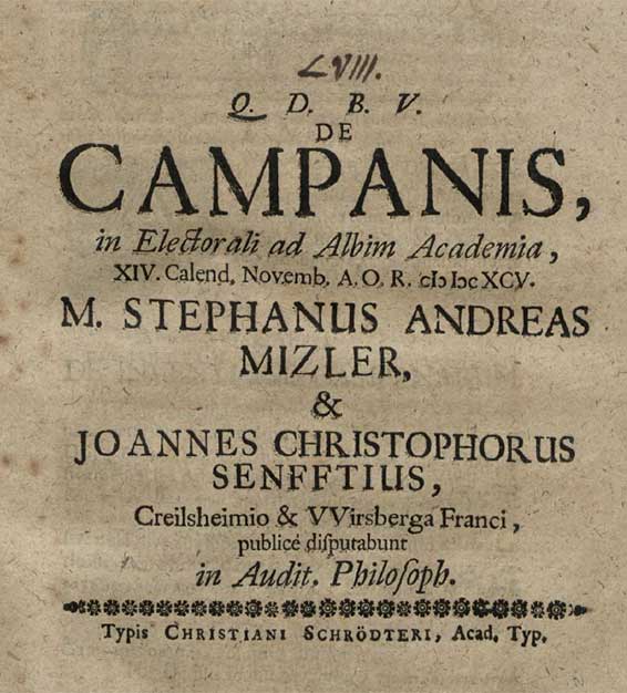 ...De Campanis, in electorali ad Albim Academia, XIV. Calend. Novemb. A. O. R. MDCXCV. M. Stephanus Andreas Mizler, & Joannes Christophorus Senfftius, Creilsheimio et Wisberga Franci, publicè disputabunt in audit. Philosoph