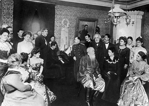 Vladimir Stasov (assis au centre), Fiodor Chaliapine (debour derrière le pianiste), César Cui (acoudé au piano),