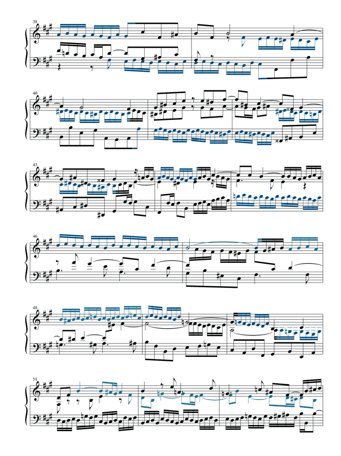 H. Keller : Cette fugue représente un cas unique dans tout le CBT. C'est une triple fugue qui avec le secours de ses 3 voix, seulement sait associer ses trois sujets … Elle évoque déjà, pour nous, l'Art de la fugue ( BWV 1080), ce contrepoint VIII, qui développe trois sujets, tout en ne mettant en œuvre que 3 voix... Lors des mes. 1-20, seul A est en cause, alors que B régnera sans partage dans les mes. 20-28. A vient s'unir à B 28-36. C sera seul de la mes. 36 à la mes. 51…