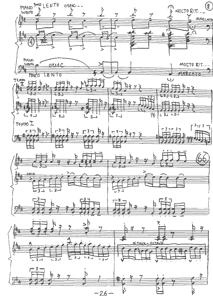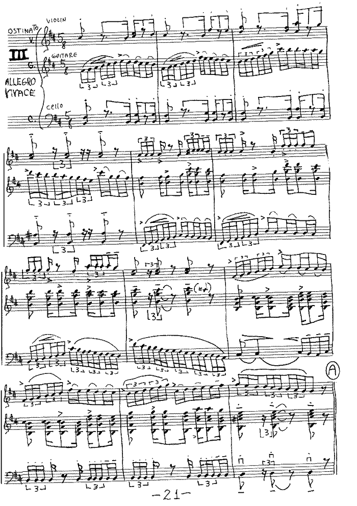 Mon trio [CD EGTA] n'a pas la prétention de se comparer au génie de ses œuvres. Fantasia concertante est comme une peinture naïve, qui cherche avant tout à saisir une partie de cette âme perdue dans le temps et dans l'espace. C'est un tribut, un hommage. Du point de vue de la composition, on trouvera des allusions aux Bachianas 7 et 8, des souvenirs des Préludes ou Études pour guitare, du Sextuor mystique. De ce dernier émerge un groupe des notes qui est constamment transformé dans le trio et qui sert de thème unificateur aux trois mouvements.