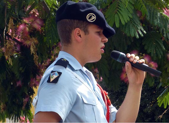 Sur la scène du Théâtre de verdure, ils font leur entrée avec une « Marche des soldats » de Robert Bruce, mélodie lente aux origines écossaises du 14e siècle — la célèbre bataille de Bannockburn de 1314 — qui s'inspirait d'un hymne national Scots wha hae avant d'accompagner, à l'époque moderne, un cérémonial militaire. Ainsi débutait, dimanche 29 juin à Villefranche sur mer, l'impressionnante parade réalisée par la Fanfare du 27e bataillon des chasseurs alpins. Une semaine de prestations orchestrales et chorales dans les Alpes-Maritimes afin de commémorer le centenaire de la Grande Guerre. Emmenés par l'adjudant-chef et directeur Éric Moron, une vingtaine d'instrumentistes aux provenances diverses mais tous passionnés de musique, ont ainsi déroulé un programme hétéroclite : Highland Cathedral, air populaire destiné à la grande cornemuse et composé par Ulrich Röver et Michael Korb pour des jeux écossais tenus en Allemagne. Puis, une version chantée de la « Protestation » des années 1880 lorsque l'état-major tenta d'imposer aux chasseurs alpins une tenue identique à celle de l'infanterie. Les « Diables » qui resteront de bleu vêtus, enchaînent avec Honneur au 27e BCA écrit par le caporal et percussionniste Emmanuel Poux pour les traditionnels cors de chasse, l'attribut symbolique figurant sur leur uniforme, puis « 76 trombones » aux forts accents américains issus de la pièce de Meredith Wilson The music man(1957).