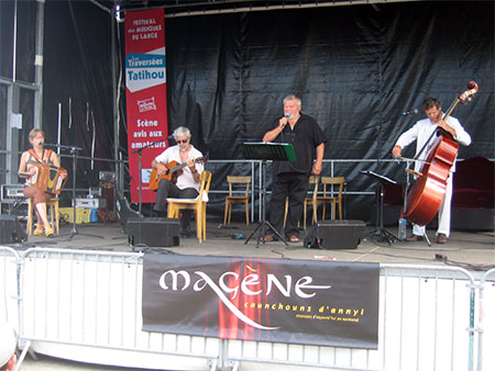 Mais avant de gagner l'île, un petit détour par Saint-Vaast où, ce vendredi, la scène amateur propose Magène. Et comme nous sommes dans le Cotentin, Magène, c'est la mémoire de la langue normande — on pourrait dire patois si ce mot n'avait que le sens de langue populaire régionale, sans le mépris dédaigneux qui l'accompagne souvent — une langue qui se perd de plus en plus au quotidien, comme le cajun qui lui ressemble. Elle persiste par les textes de quelques poètes et romanciers qui depuis un siècle se sont mis à l'écrire, paradoxe des langues orales qui ne veulent pas s'effacer. Et Magène, depuis presque vingt cinq ans, met ces textes en musique avec un groupe dont Théo Capelle est la voix, grave et puissante. Il sait, avec bonhomie et humour, nous les présenter en quelques mots et les traduire pour ceux qui ne comprennent pas. Jean Louis à la guitare, Manuela à l'accordéon et Dany à la contrebasse l'épaulent sobrement.