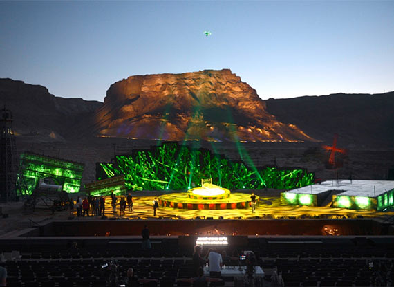 « Oh gioia »1. Un paysage minéral, stérile, brûlant… et, magie, un opéra improbable, venu de nulle part : 7600 places, 3000 m2 de scène. Nous sommes au pied de Massada, forteresse d'Hérode, surplombant la Mer morte. L'Opéra d'Israël s'y installe (pour en repartir) depuis plusieurs années et y présente un opéra susceptible de drainer le plus large public, un peu comme Vérone ou Bregenz en sont devenus les meilleures illustrations.